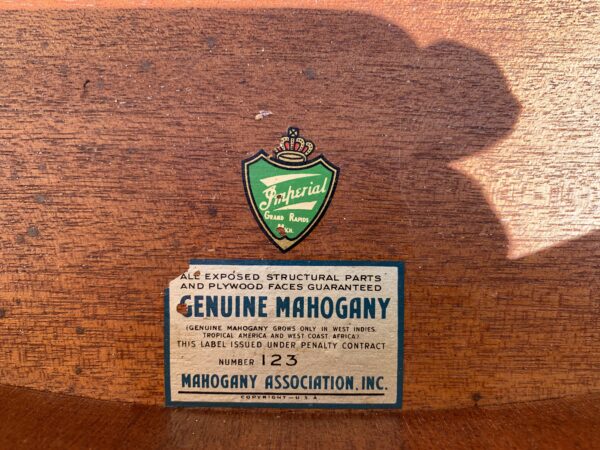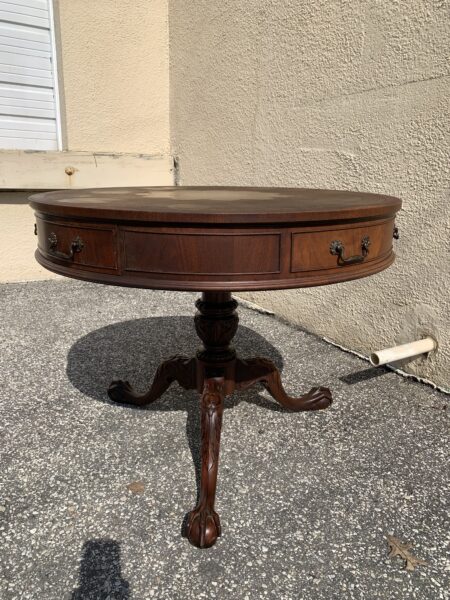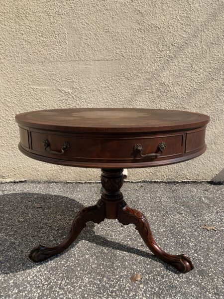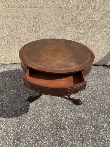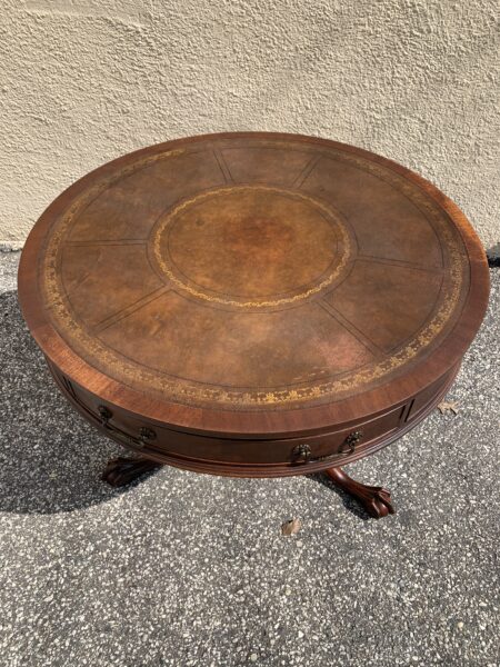 IMPERIAL – 1940s leather top drum table with drawer 36″d x 36″d x 28″h top has sun fading, wear Price: $125 Location: 7900 Belair Road, Baltimore