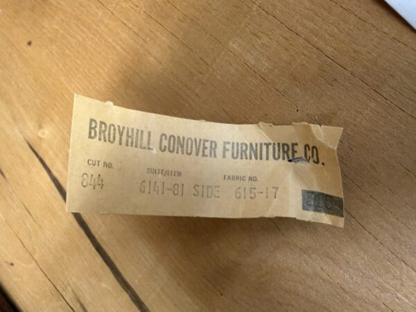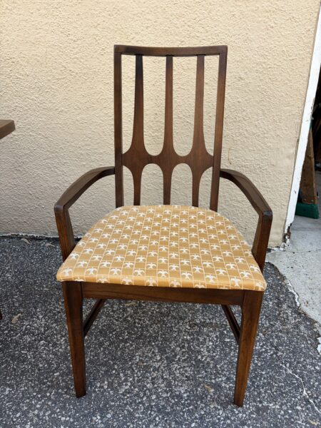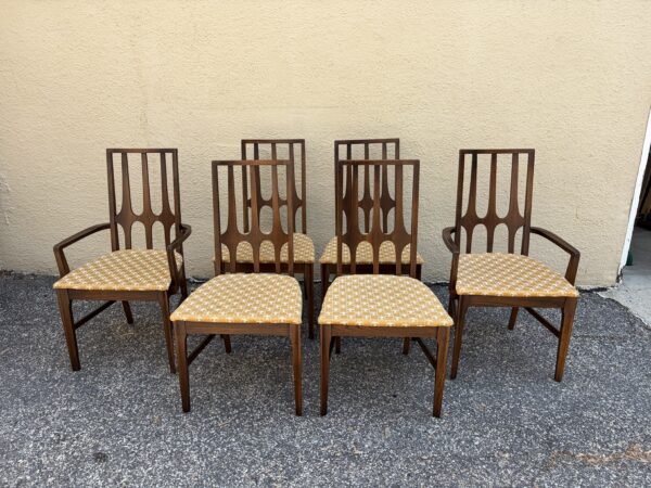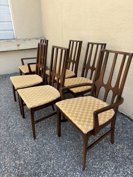 Broyhill “Brasilia” mid century set of 6 walnut dining room chairs 2 arm, 4 side Original clean fabric, but padding is flattened Price: $1,400 Location: 7900 Belair Road, Baltimore