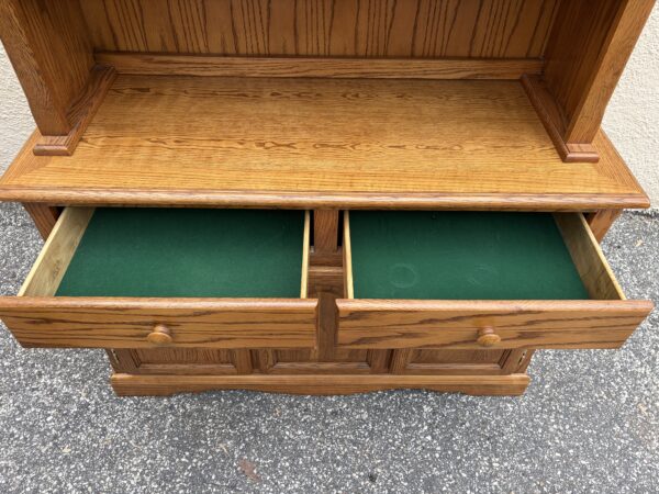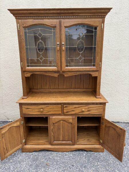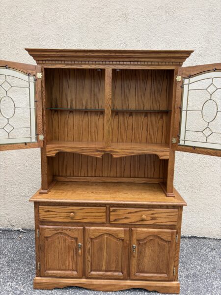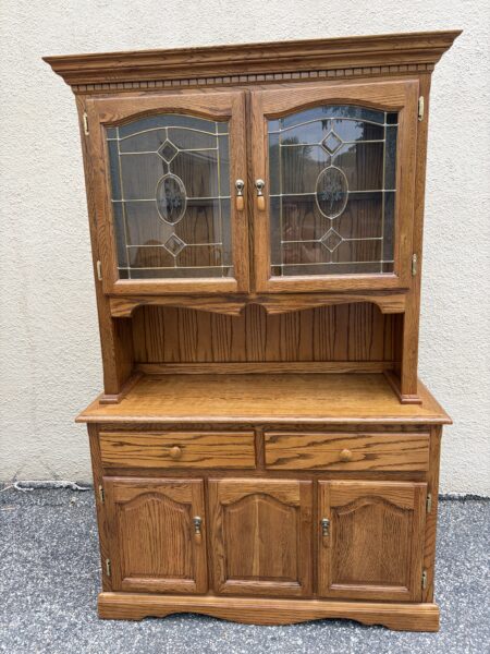 Oak country kitchen step-back hutch with leaded glass top doors 48″w x 18″d x 76″h Price: $295 Location: 7900 Belair Road, Baltimore