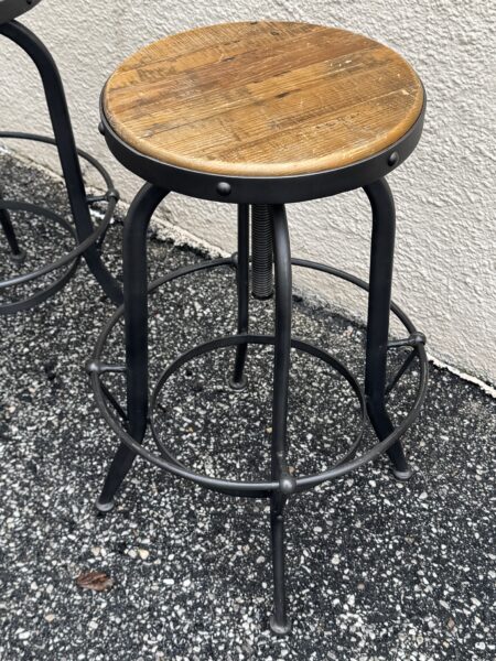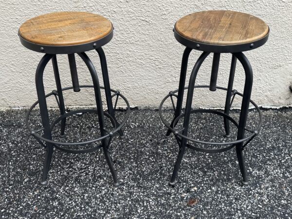 Pair Adjustable Industrial Iron & Wood Top Counter Stools Lowest Seat Height 27.5″ Price: $150 Pair Location: 7900 Belair Road, Baltimore