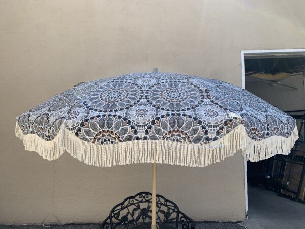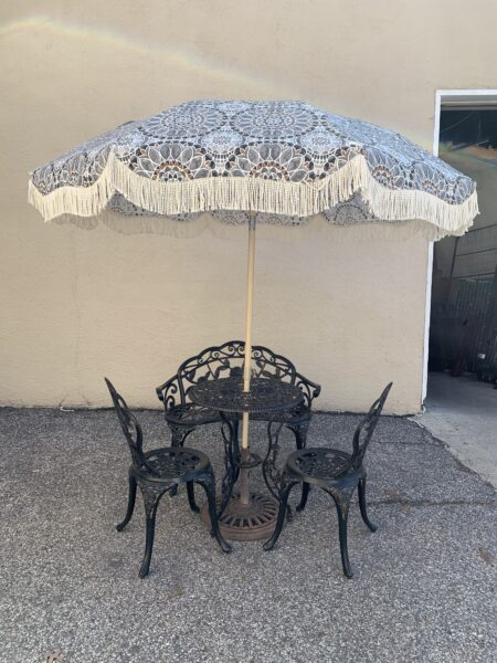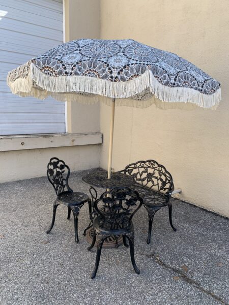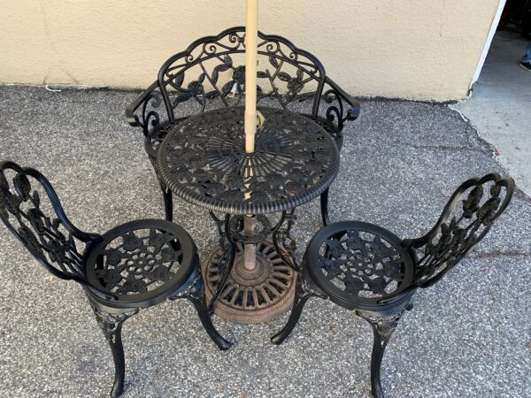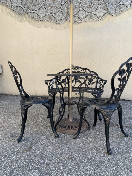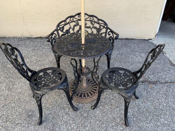 Cast Aluminum Oil Rubbed Bronze Finish Patio Set With Umbrella & Umbrella Stand Table 24″d x 27″h Bench 39 3/4″w x 14.5″d x Seat Height 16″h Price: $325 Set Location: 7900 Belair Road, Baltimore