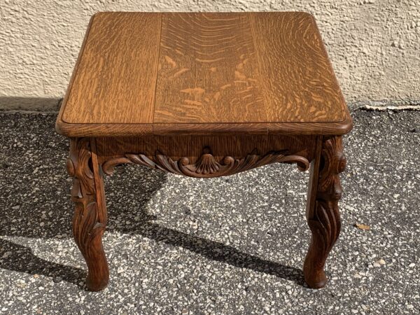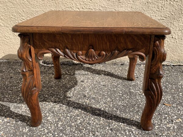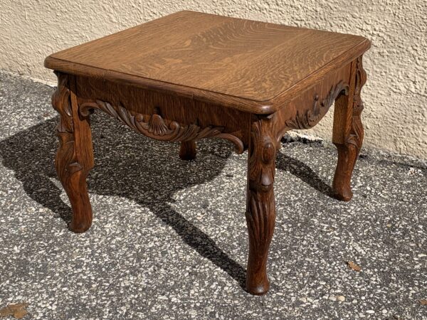 Antique Oak Carved Low Side Table 20″w x 20’d x 16″h Price: $90 Location: 7900 Belair Road, Baltimore