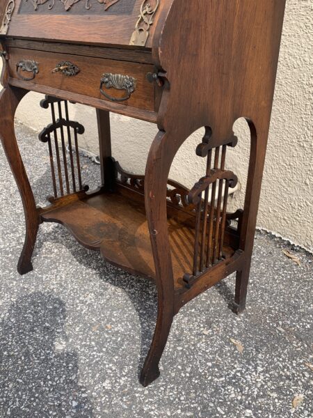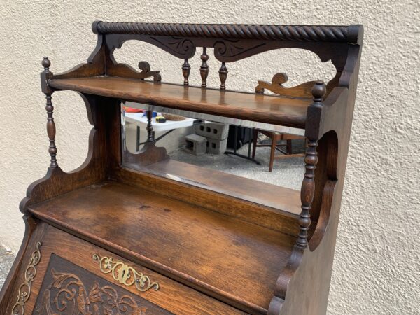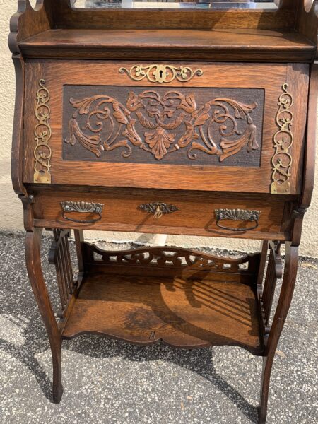 Ornate Antique Victorian Slant Top Desk With Mirrored Shelf Top Burn Inside Desk Lid 26″w x 15″d x 59″h Price: $250 Location: 7900 Belair Road, Baltimore