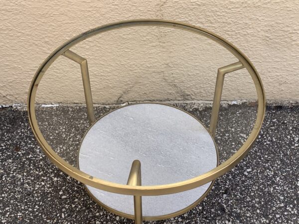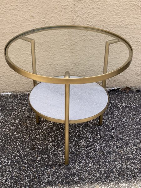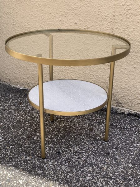 Contemporary Glass , Stone & Brushed Brass Round Tiered End Table 21.5″d x 20″h Price: $75 Location: 7900 Belair Road, Baltimore