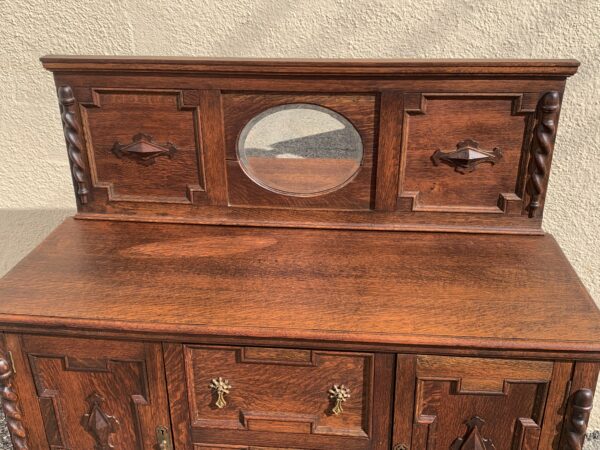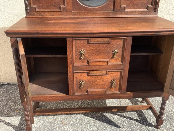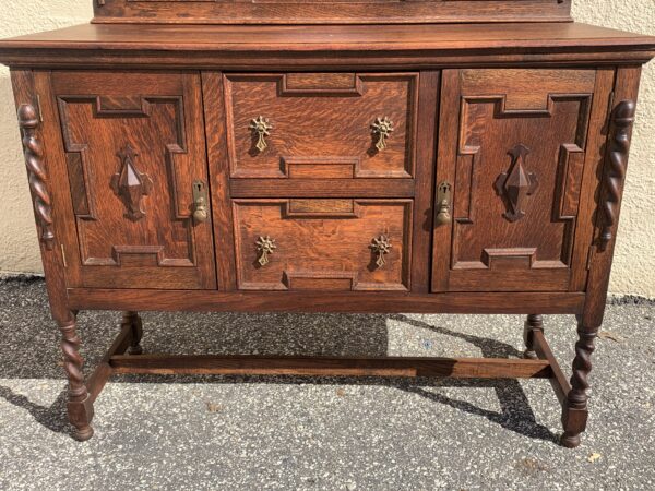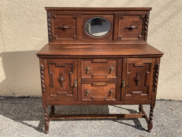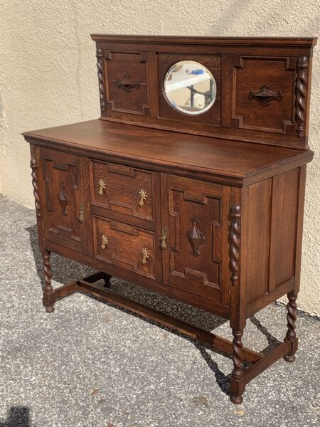 Antique Oak Jacobean Barley Twist Sideboard With Mirrored Backsplash 47.5″w x 18″d x 35.5″h 51.5″h With Backsplash Price: $395 Location: 7900 Belair Road, Baltimore