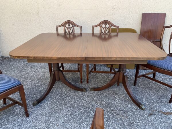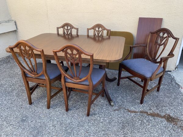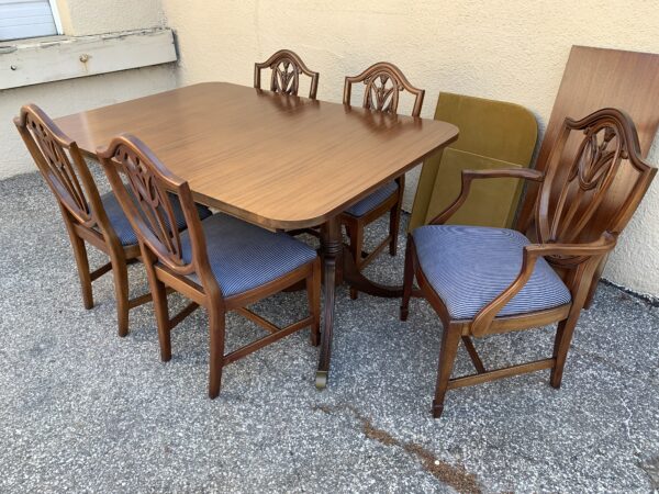 1950’s Mahogany Duncan Phyfe Dining Table , Leaf & 5 Chairs Table 62″w x 42″d x 30″h Leaf 16″ Price: $395 Set Location: 7900 Belair Road, Baltimore