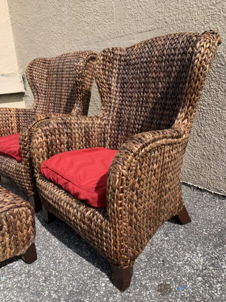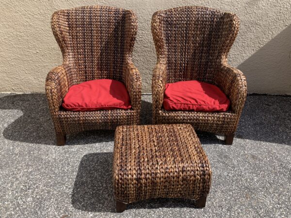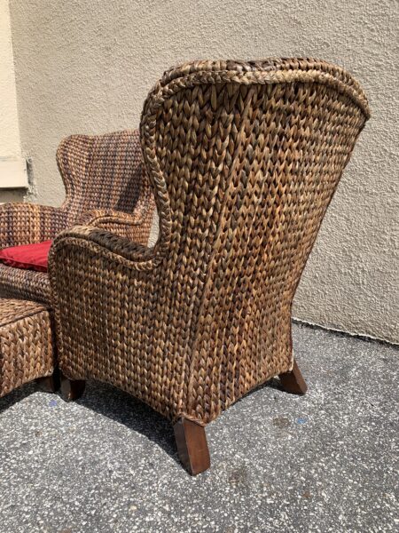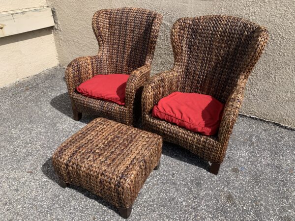 Pottery Barn “Seagrass” Woven Pair Wing Back Chairs & Ottoman 29″w x 40″h Price: $295 Pair Location: 7900 Belair Road, Baltimore